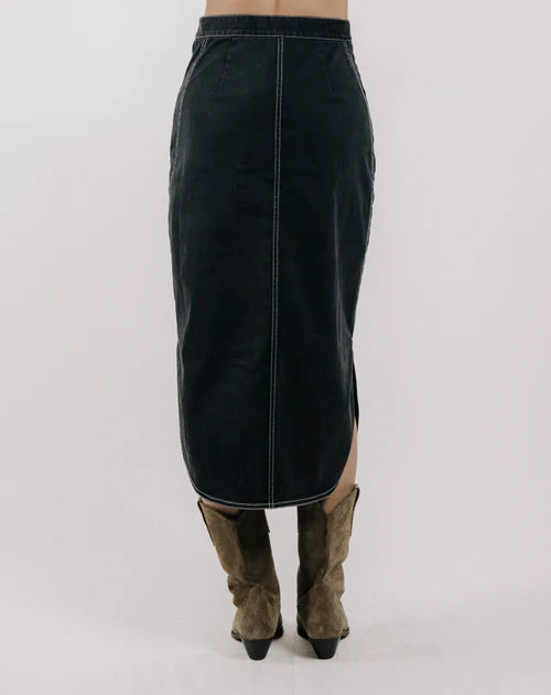 The Apolline Skirt is a high-waisted denim midi with contrast stitching and a full button-down front. Its structured silhouette and versatile dark wash make it an effortless piece for day-to-night styling.