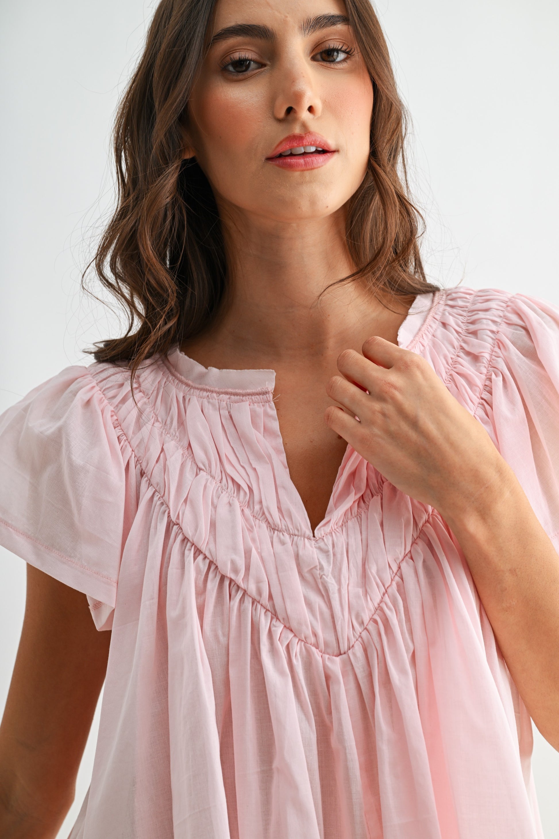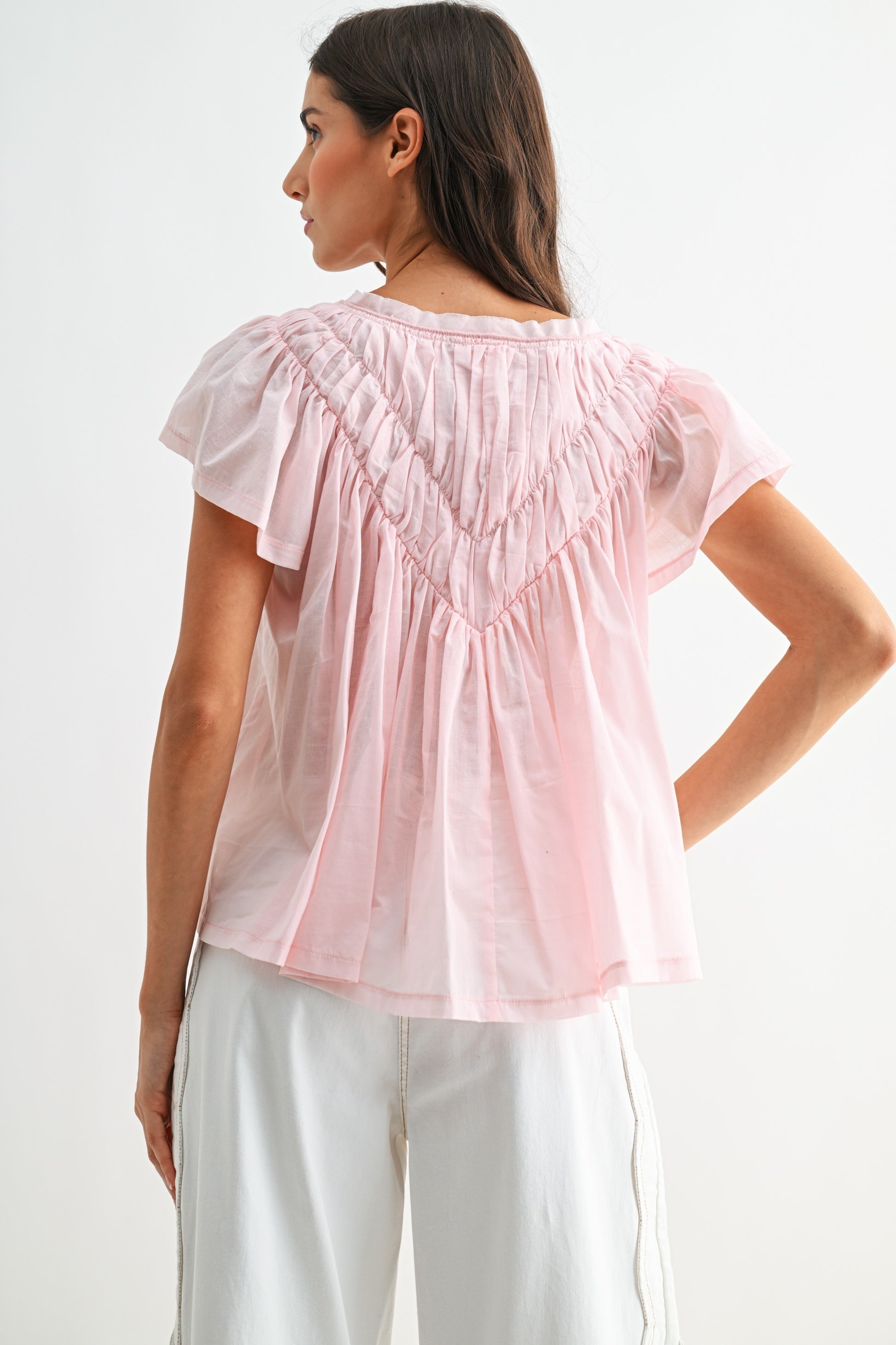 This top combines comfort with style, making it a wardrobe must-have. The unique gathered neckline and flutter sleeves add an elegant flair while the soft fabric drapes beautifully. Whether you're aiming for a casual or dressy look, this top adapts to your needs.